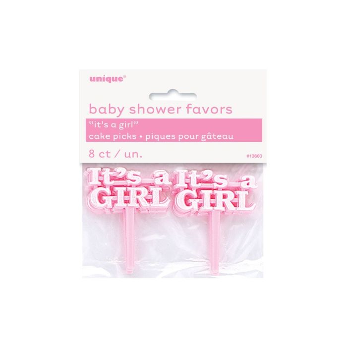 Schattige 'It's a Girl' cupcake/taart stekers in het roze. De stekers zijn per 8 verpakt en hebben een grootte van 5cmx6cm (LxB).