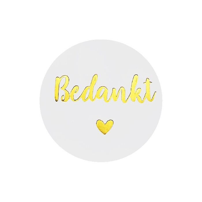 Ronde witte stickers met de tekst 'Bedankt!' en een hartje in goudfolie. De stickers hebben een doorsnede van 3cm. Eén verpakking bevat 24 stickers.