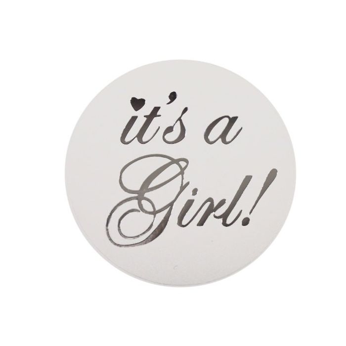 Kleine ronde stickers met zilveren tekst "It's a Girl!". Leuk om op een bedankje te plakken! De stickers hebben een doorsnede van 3 cm. In een verpakking zitten 24 stickers.