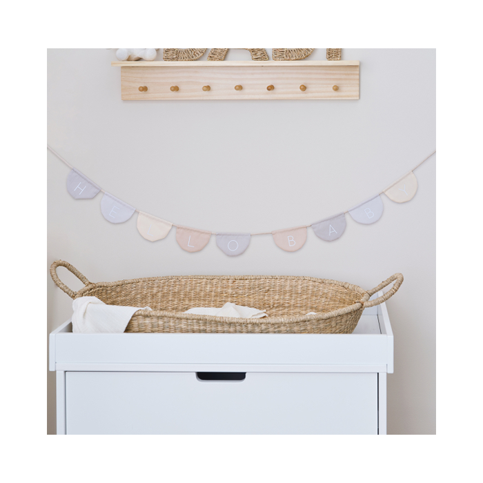 Deze stoffen Hello Baby slinger van Ginger Ray is het perfecte accessoire voor elke kinderkamer. Stijlvol en neutraal, deze prachtige slinger kan zowel op je babyshower als in je kinderkamer worden gebruikt - het is het perfecte cadeau voor de aanstaande mama om van te genieten! Elke verpakking bevat: 1 x kinderkamer vlaggenlijn van 1,6 m lang, met 9 vlaggen.