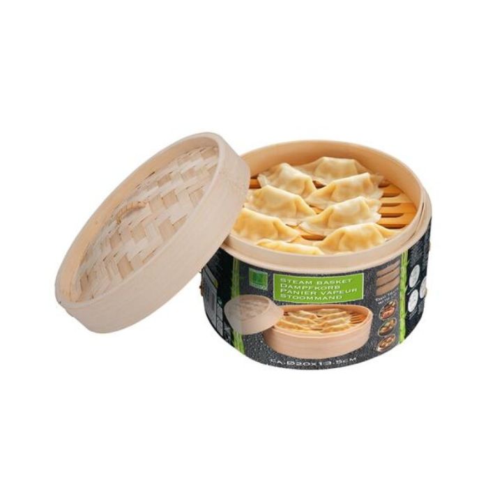 Een bamboe stoommand is een nuttig keukengereedschap voor het bereiden van gestoomd voedsel. Het bestaat uit twee niveaus, die op elkaar kunnen worden gestapeld en op een pan met kokend water kunnen worden geplaatst. Voedsel dat gestoomd moet worden, kan in de stoomschaal worden geplaatst en wordt vervolgens gestoomd door de stoom van het kokende water. Dit handige keukenhulpmiddel kan worden gebruikt om verschillende soorten voedsel te bereiden, zoals: