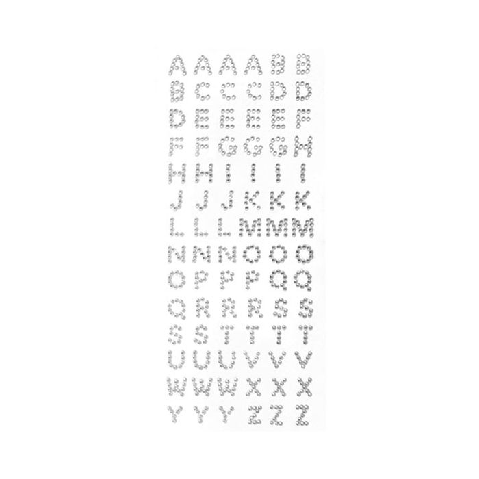 Strass letters stickervel in diverse kleuren verkrijgbaar. Eén stickervel bevat 84 strass letters. De letters hebben een afmeting van 1 x 1 cm.