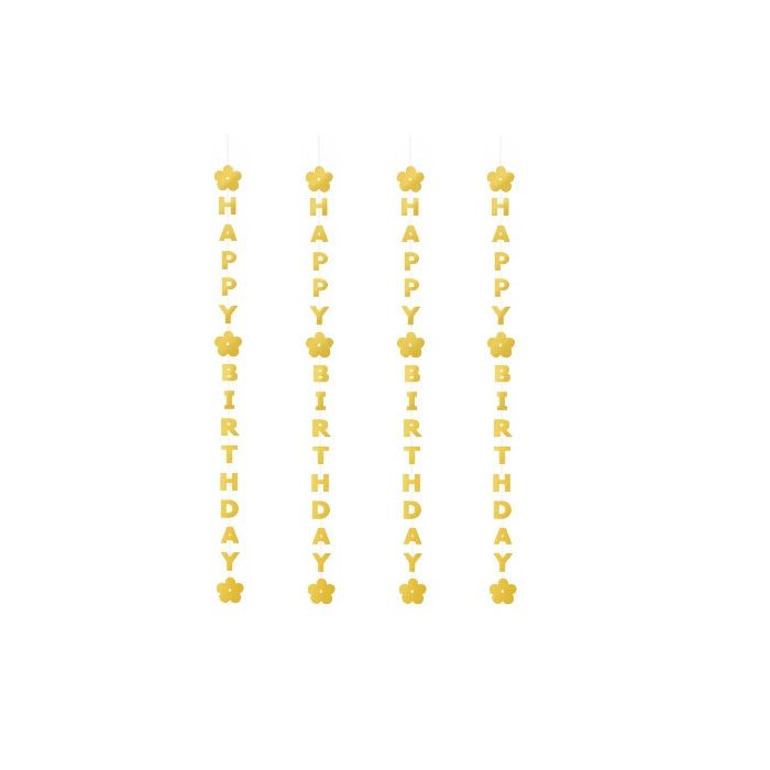 Papieren 'Happy Birthday' string decoratie in het goud. De string slinger is ongeveer 2,5 meter lang en kan je aan de muur, aan het plafond, voor het raam of in de deuropening hangen.