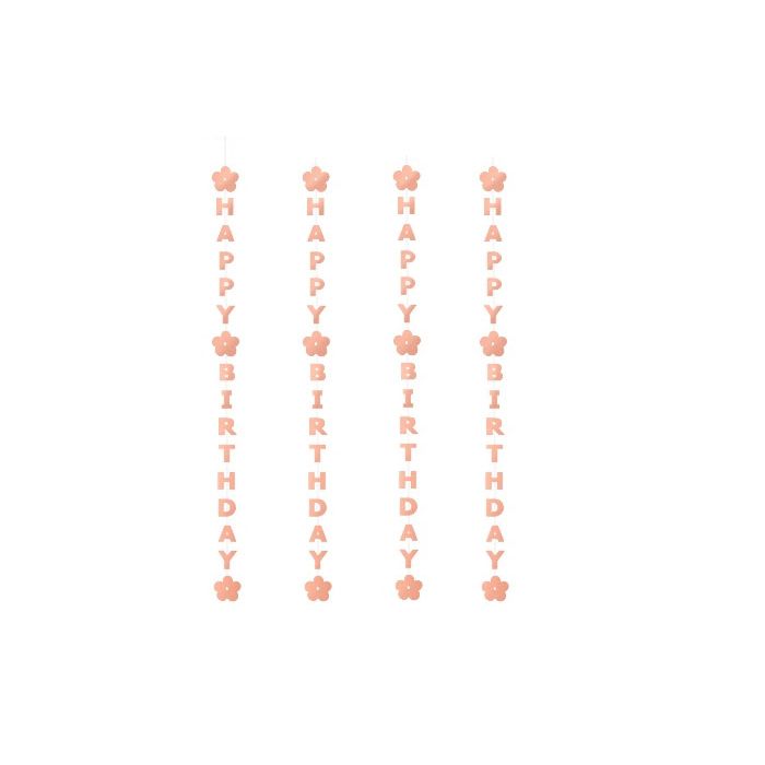 Papieren 'Happy Birthday' string decoratie in het roségoud. De string slinger is ongeveer 2,5 meter lang en kan je aan de muur, aan het plafond, voor het raam of in de deuropening hangen.