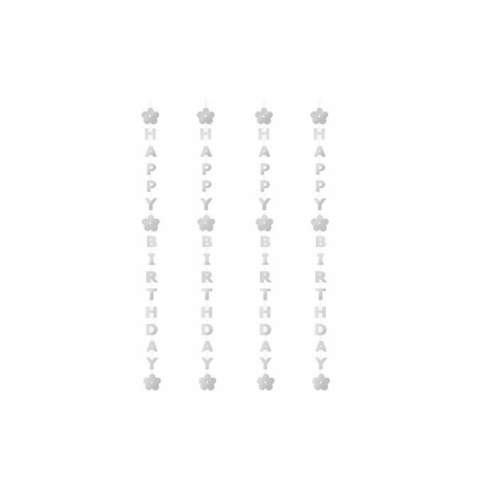 Papieren 'Happy Birthday' string decoratie in het zilver. De string slinger is ongeveer 2,5 meter lang en kan je aan de muur, aan het plafond, voor het raam of in de deuropening hangen.