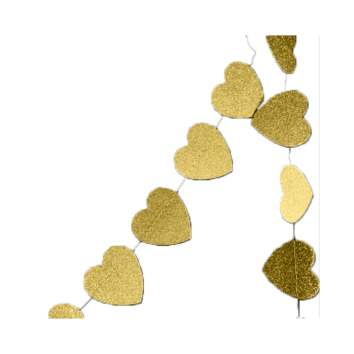 Leuke string decoratie met hartjes in glitter goud. De slinger bestaat uit 16 hartjes met elk hartje van ongeveer 9 cm.