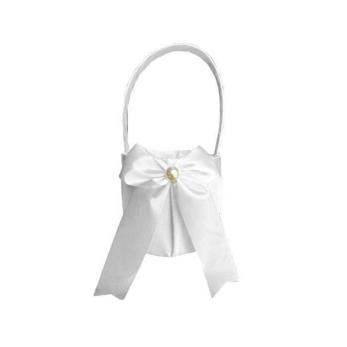Strooimand van satijn in het wit met strik- en pareldecoratie. De mand heeft een dia van 12cm en een hoogte van 11cm. Met het hengsel heeft de mand een hoogte van 23,5cm.