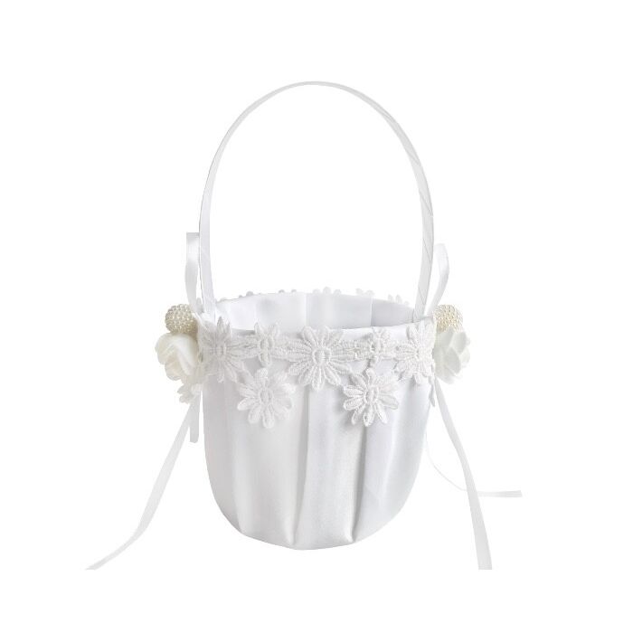 Satijnen strooimand gedecoreerd met geborduurde bloemen en aan beiden zijden foam roosjes, parels en strikjes. De mand heeft een dia van 11-14cm en is circa 21cm hoog.