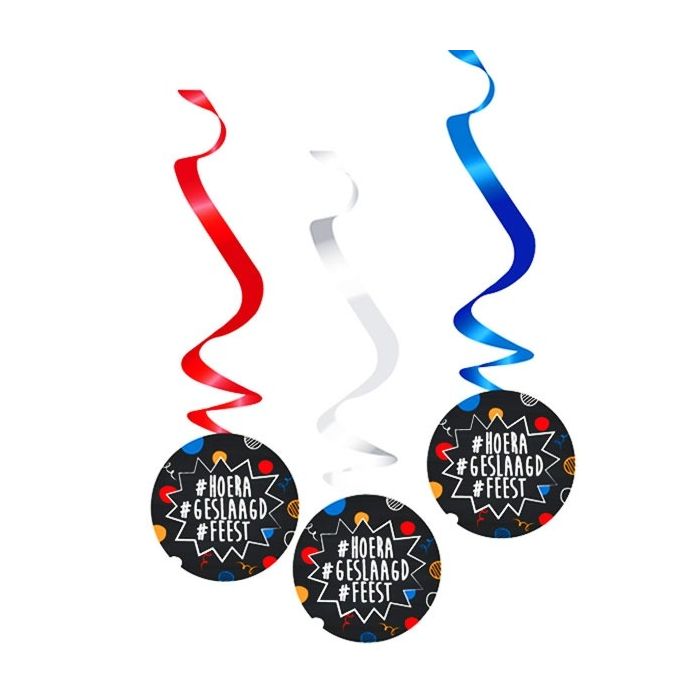 Hangdecoratie met de tekst '#HOERA #GESLAAGD #FEEST'. Verpakt per 3 stuks.