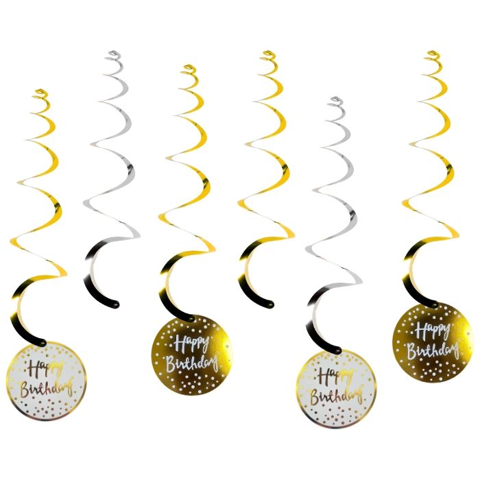 Prachtige Happy Birthday swirls hangdecoratie in de kleuren goud, zilver en wit. De swirls zijn van folie materiaal met onderaan een cirkel van papier. Op de cirkel staat de tekst 'Happy Birthday', versierd met polka dots. De papieren cirkel moet nog wel aan de swirl bevestigd worden met de bijgeleverde tie rips. Een verpakking bevat 4 goudkleurige swirls, 2 zilverkleurige swirls en 4 ronde cirkels.