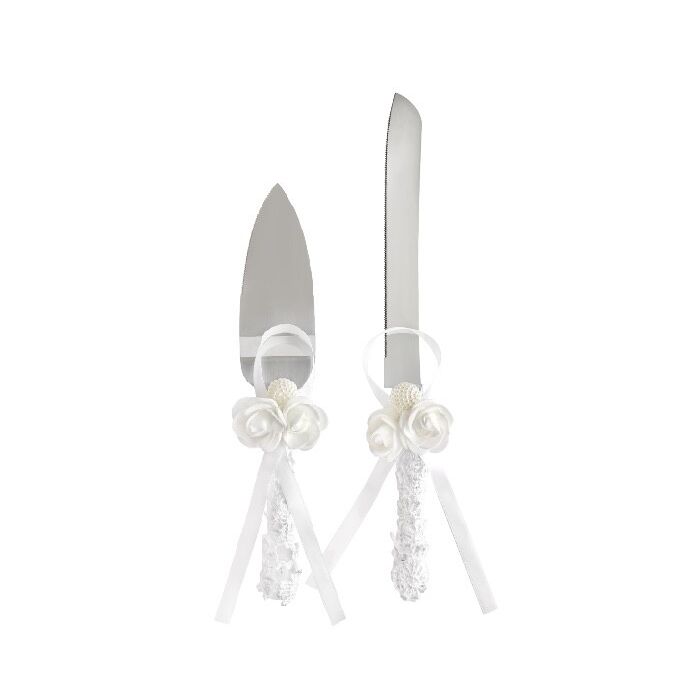 Taartset bestaande uit een mes en een taartschep. Beide met handvaten en kanten decoratie en kunstroosjes. De taartschep is ca. 27cm lang en de mes is ca. 33cm lang.
