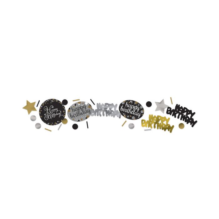 Prachtige 'happy birthday' confetti in de kleuren goud, zilver en zwart. Met deze confetti geef je iedere tafel of feestlocatie een speciale touch. De verpakking bevat 34 gram confetti.