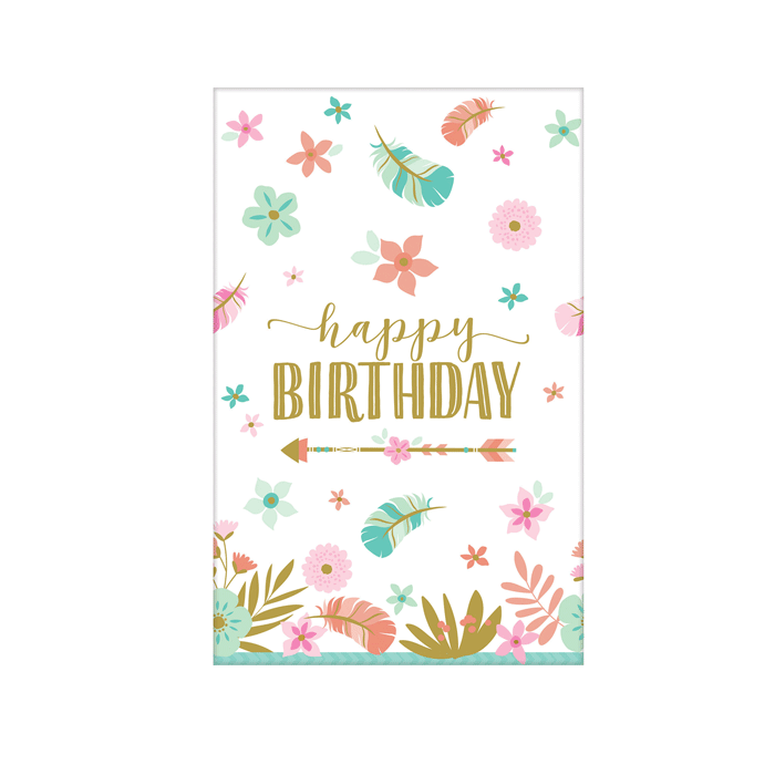 Papieren tafelkleed met een gouden 'Happy Birthday' opdruk en versierd met een Boho rand van veren, bloemen en bladeren. De tafekleed is 137 x 243 cm groot.