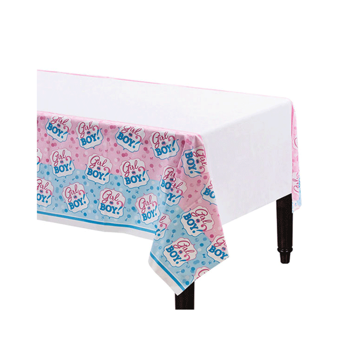 Plastic tafelkleed bedrukt met de tekst Girl or Boy?, speciaal voor een Gender Reveal. De tafelkleed is 108 x 180 cm groot.