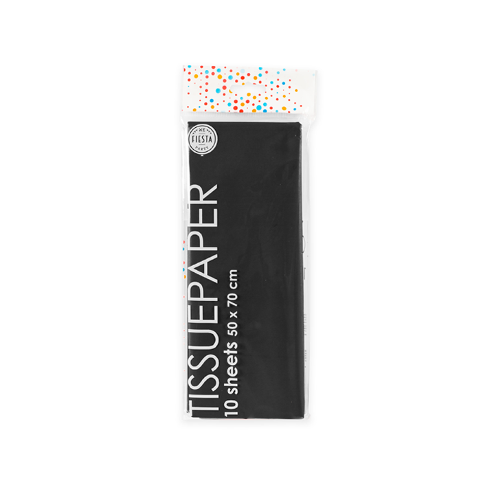 Zwarte tissue papier voor het opvullen van bijv. een cadeautje. Tissue papier zorgt voor een vrolijke opvulling van uw cadeaus. In één pak zitten 10 vellen. Een vel tissue papier is elk 50 x 70 cm. De tissuepapier is watervast.