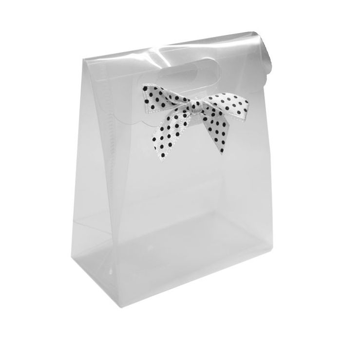 Transparante PVC cadeautas. Achter het strikje is een klittenbandje bevestigd om het tasje dicht te maken. De tas heeft een afmeting van 15,5 x 7 x 20,7 cm (LxBxH).