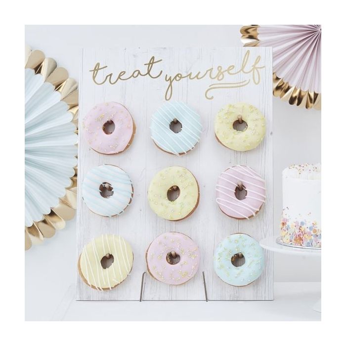 Mooie Treat Yourself Donut Wand om je donuts of andere lekkere dingen op te hangen. De donut muur is van stevig karton en komt in de kleur wit en goud. De donutwand heeft een afmeting van 42 cm (H) bij 32 cm (B). Het pakket bevat negen pinnen.