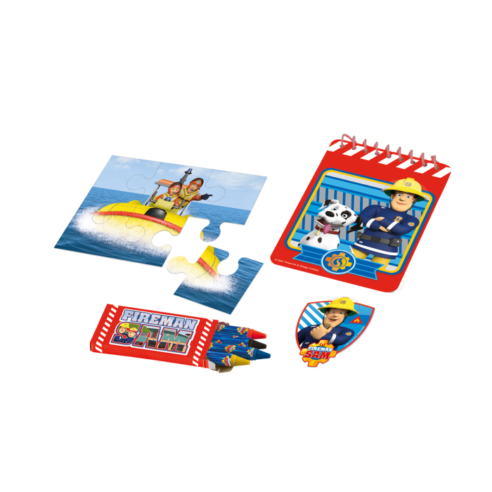 Set van 24 stuks uitdeelspeelgoed van Brandweerman Sam. Elke verpakking bevat 6 puzzels, 6 kladblokjes, 6 stickers en 6 pakjes waskrijtjes.