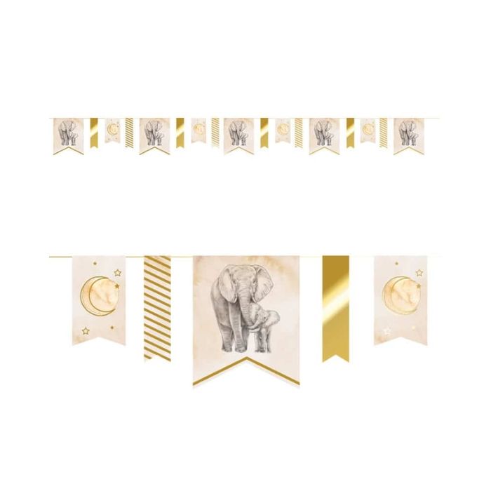 Een babyshower moet tot in de puntjes verzorgd zijn, dus laat het groots zien! Met de Baby Safari-slinger wordt dat zeker een succes. De slinger is ideaal voor een stijlvolle, genderneutrale babyshower! In de verpakking zit één slinger van 4 meter lang met vaantjes als vlaggen. De slinger is gemaakt van papier en is het beste geschikt voor binnengebruik. De vlaggen zijn nude van kleur met een waterverfeffect en zijn versierd met twee olifantjes. Tussen de vlaggen hangen smallere vlaggen, goudkleurig of wit met gouden strepen. Ook zijn er kleinere vlaggen met een halve maan en sterren. Deze slinger is perfect te combineren met andere producten uit de prachtige Baby Safari Nude-collectie.