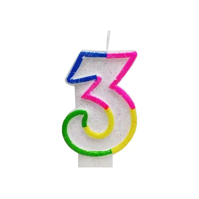 Verjaardagskaars cijfer 3 voor op de taart. Combineer met andere cijfers. De kaars is 7,5 cm groot.