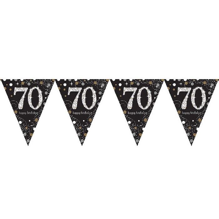 Zwarte '70 Happy Birthday' vlaggenlijn met metallic gouden en zilveren cirkels & sterretjes. De vlaggenlijn is 4 meter lang.