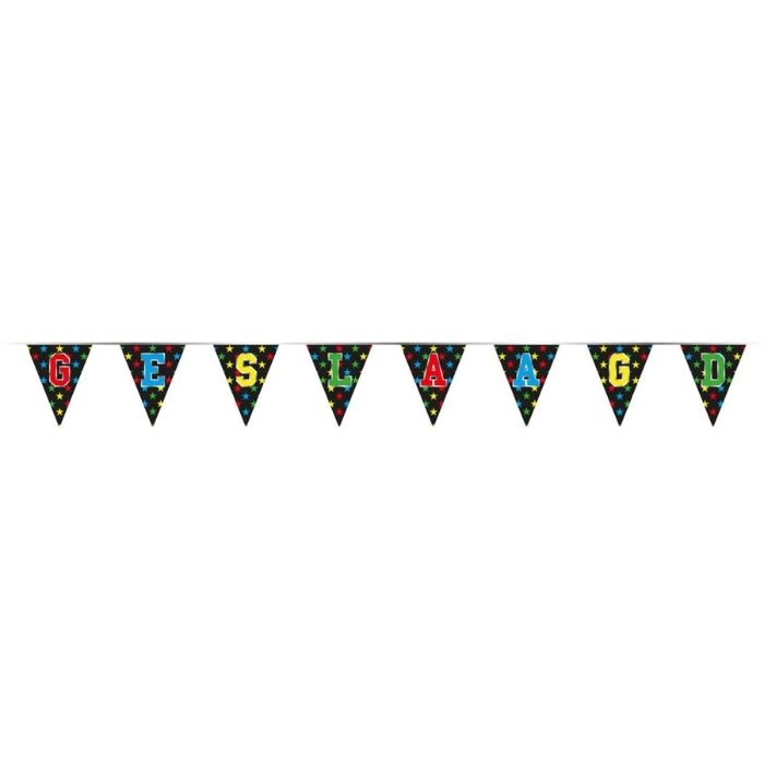 De plastic 'Geslaagd' vlaggenlijn is 4 meter lang en elk puntvlaggetje heeft een lengte van 26,5cm. De vlaggetjes zijn aan één zijde beprint.