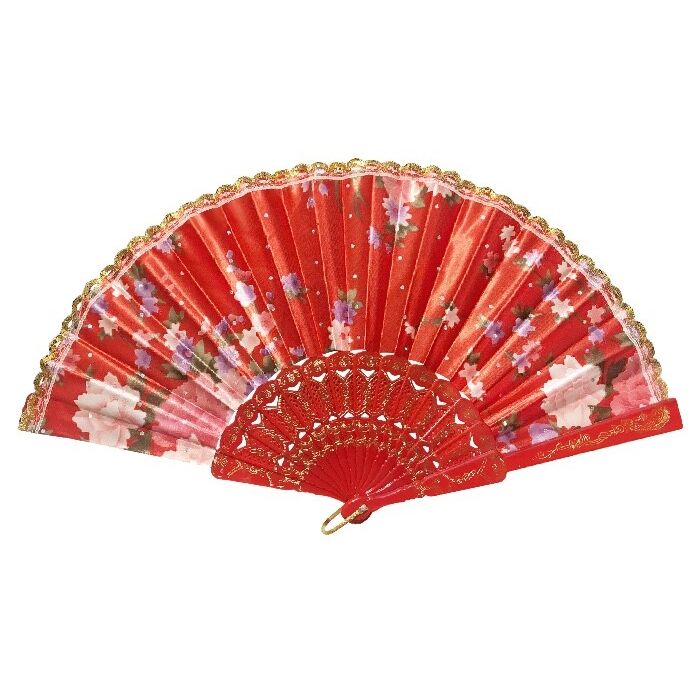 Satijnen waaier met bloemenprint in het rood. De frame van de waaier is van plastic. De waaier is 23 cm lang.