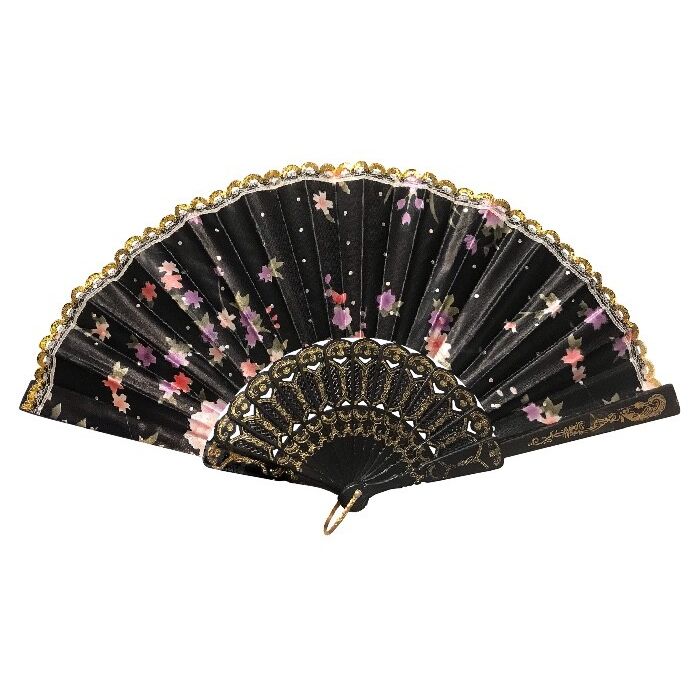 Satijnen waaier met bloemenprint in het zwart. De frame van de waaier is van plastic. De waaier is 23 cm lang.