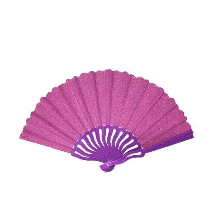 Papieren glitter waaier in de kleur paars. De frame van de waaier is van plastic. De waaier is 23 cm lang.