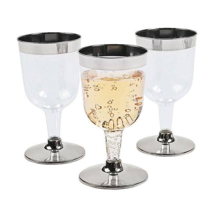 Hard plastic wijnglazen met metallic zilveren rand en voet. Deze champagneglazen geven een extra luxe tintje aan je feest!