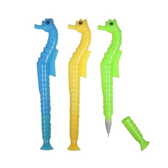 Plastic pen met een fijne punt, in de vorm van een zeepaardje. De pen is 15 cm lang. Een pakje bevat 3 pennen. De kleuren van de pennen kunnen per pak verschillend zijn.