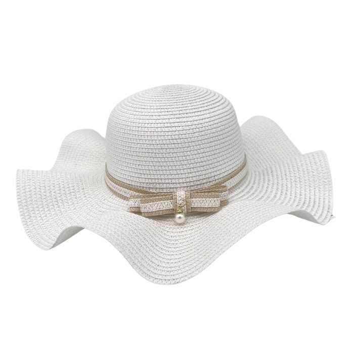 Elegante zomerhoed van stro met een golvende rand voor dames. Deze witte hoed is versierd met een strik en een parel. Naast het bieden van bescherming tegen de zon, voegt de hoed ook een vleugje elegantie toe aan elke zomerse outfit. Perfect voor een dagje aan het strand, een tuinfeest of een ontspannen wandeling in het park. Combineer deze hoed met een luchtige jurk en sandalen voor een moeiteloos chique uitstraling.